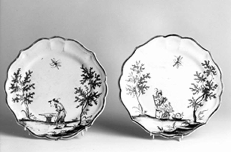 Piatto da frutta con orlo mistilineo a quattro punte, senza anello d'appoggio, totalmente rivestito di smalto.\nLa parte centrale del piatto ospita una decorazione "a paesini e figurine".