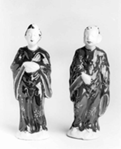 Statuetta di dama cinese mostra un leggero dehanchement. Porta i capelli raccolti sulla nuca e mani conserte appoggiate sul ventre. Veste all'orientale una tunica dal bordo a pendoni e ampie maniche. La veste è totalmente rivestita di smalto blu e con colori a freddo erano dipinti in nero i capelli e gli occhi, in rosa le labbra. Piccoli steli fioriti recisi in oro decorano la veste