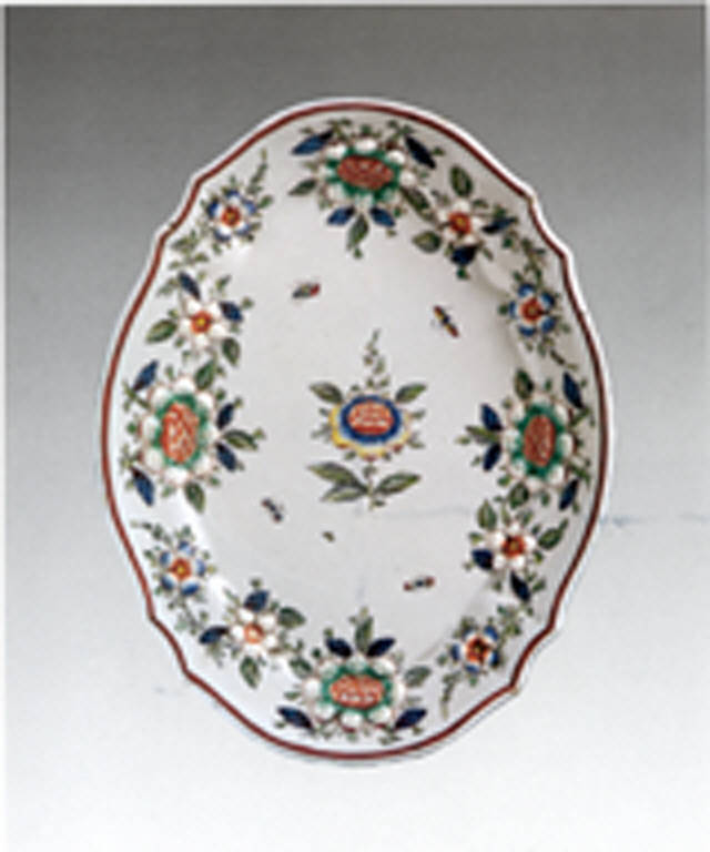 Piatto ovale (fiamminga) con orlo mistilineo e tesa costolata, senza anello d'appoggio. Il decoro a fiori a rilievo vede al centro del fondo un fiore reciso, la cosiddetta peonia arborea, in scorcio.