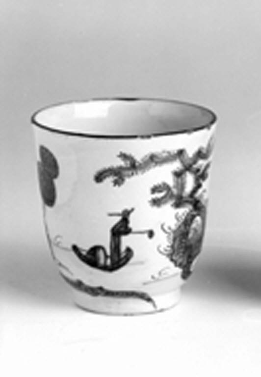 Tazza a campana dal bordo svasato su base ad anello. \nIl decoro a carabiniere è ordinario: l'oro è sostituito dal giallo. Il profilo superiore della bocca è listato in rosso scuro.