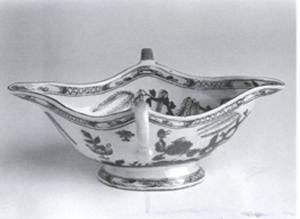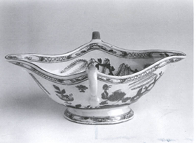 Salsiera dal corpo a navicella dal profilo morbidamente ondulato e appuntito agli estremi, su base ovale con due anse ad orecchio laterali. il motivo decorativo dello struzzo è ripetuto tre volte:sulle pareti esterne della salsiera e all'interno dell'invaso. L'oro lumeggia il decoro dipinto in blu rosso e orla la forma.