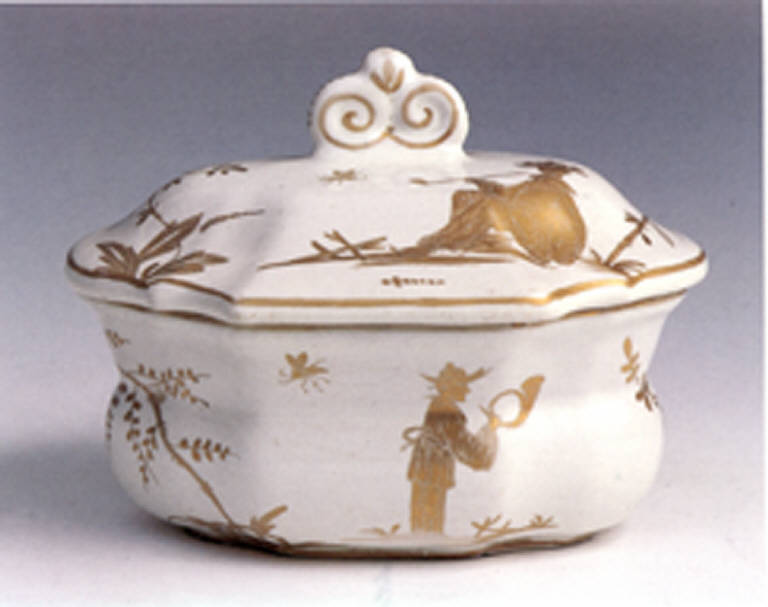 • NOTIZIE STORICO CRITICHE Da un lato è evidente la familiarità di questa impaginazione decorativa con i motivi alla "chiense blu e coloretti" documentati nell'invetario di Felice Clerici. Altrettanto evidente è, però, la loro coerenza con pezzi attribuiti sicuramente a Pasquale Rubati decorati con "chinesi" oro e una fascia a oeill de pedrix e con la tulipaniera che trova lo stesso bamboccio orientale in un medaglione mistilineo a fondo arancione e che porta marca del "chiodo in manganese" che va assegnato a Rubati. Tutto ciò costringe alla salomonica conclusione di inserire questi cinesi nel repertorio sicuramente condiviso nelle due manifatture milanesi o, forse più arditamente ad attribuire queste figurine "chinesi" alla mano di Rubati stesso, prima pittore stipendiato da Clerici e poi padrone di se stesso.\nLa moda di dipingere queste figurine orientali in monocromia oro, ispirata a porcellane e a lacche cinesi,aveva già preso piede: a Meissen dal 1710 vi si dedicava Cristoph Konrad Hunger e numerosi Hausmalern di Augsburg. Dalla Sassonia questo particolare tipo di cineseria si era molto diffusa sulla porcellana europea e italiana, ne conosciamo esemplari sfornati dalla manifattura veneziana di Giovanni Vezzi e toscana di Carlo Ginori.