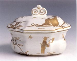 - NOTIZIE STORICO CRITICHE Da un lato è evidente la familiarità di questa impaginazione decorativa con i motivi alla "chiense blu e coloretti" documentati nell'invetario di Felice Clerici. Altrettanto evidente è, però, la loro coerenza con pezzi attribuiti sicuramente a Pasquale Rubati decorati con "chinesi" oro e una fascia a oeill de pedrix e con la tulipaniera che trova lo stesso bamboccio orientale in un medaglione mistilineo a fondo arancione e che porta marca del "chiodo in manganese" che va assegnato a Rubati. Tutto ciò costringe alla salomonica conclusione di inserire questi cinesi nel repertorio sicuramente condiviso nelle due manifatture milanesi o, forse più arditamente ad attribuire queste figurine "chinesi" alla mano di Rubati stesso, prima pittore stipendiato da Clerici e poi padrone di se stesso.\nLa moda di dipingere queste figurine orientali in monocromia oro, ispirata a porcellane e a lacche cinesi,aveva già preso piede: a Meissen dal 1710 vi si dedicava Cristoph Konrad Hunger e numerosi Hausmalern di Augsburg. Dalla Sassonia questo particolare tipo di cineseria si era molto diffusa sulla porcellana europea e italiana, ne conosciamo esemplari sfornati dalla manifattura veneziana di Giovanni Vezzi e toscana di Carlo Ginori.