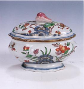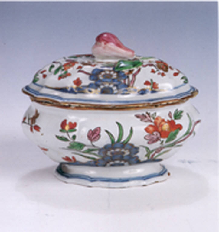 Zuccheriera dalla tipica forma milanese dal profilo mistilineo con corpo rigonfio leggermente costolato su piede rastremato e orlo leggermente estroflesso. Il coperchio è coronato da una presa a pera dipinta in modo naturalistico. Lo smalto è leggermente azzurrato.\nAll'interno dell'invaso sul fondo è dipinto un fiore stilizzato in rosso ferro e una catena di spiraline lungo il bordo. Gli orli e parti del decoro sono rialzati con profili in oro.