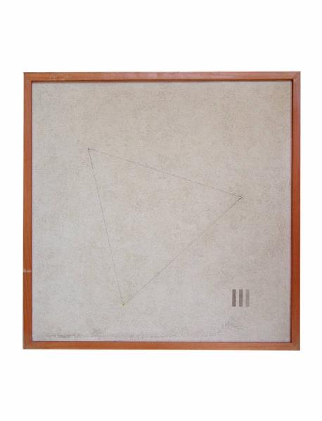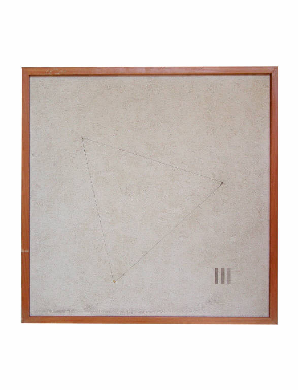 Un triangolo equilatero con uno dei vertici che si illumina di rosso quando il quadro viene collegato alla corrente elettrica; sulla destra in basso tre righe verticali parallele grigie.