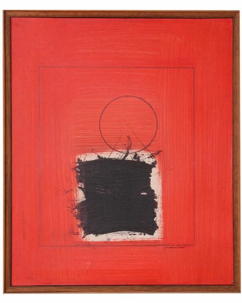 Su fondo rosso un quadrato al cui interno vi sono un cerchio ed un triangolo ed una zona di forma quadrata nera e bianca.