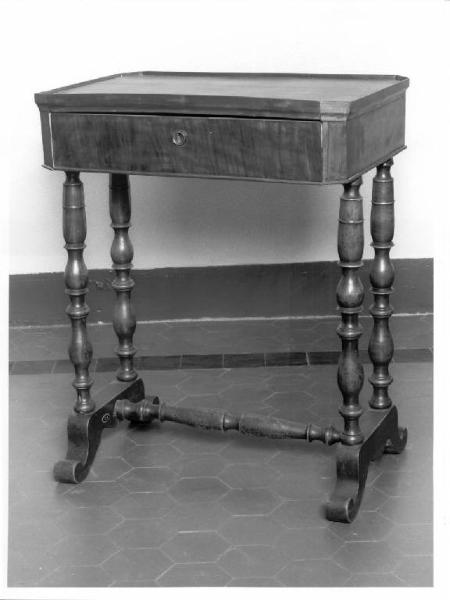 gambe tornite collegate da traversa, cassetto sotto al piano di appoggio