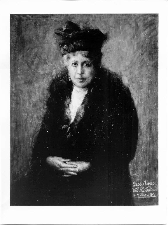 - NOTIZIE STORICO CRITICHE La benefattrice donò, con testamento olografo redatto il 15 ottobre 1895, il fabbricato e l'industria di cartonaggi sito in Milano in Via Bramante all'Orfanotrofio Maschile con l'intenzione di farvi lavorare gli orfani stessi. Il ritratto venne eseguito tre anni dopo la scomparsa della donna, avvenuta l'8 ottobre 1918, su un modello fotografico. L'opera venne inizialmente commissionata al pittore Conte Gola che chiese, però, un compenso troppo elevato, di conseguenza venne commissionata al pittore Antonio Piatti che accettò l'incarico per una somma decisamente inferiore e la consegnò nel giugno del 1921. La fisionomia della benefattrice è resa con precisione da una pennellata morbida dai toni spenti. Nel dipinto risalta l'espressione del volto della donna mentre alcuni particolari dell'abbigliamento, su cui l'artista si sofferma, sembrano appesantire la composizione. Il dipinto non presenta particolari qualità innovative in quanto risente ancora di un gusto legato a modelli ottocenteschi.