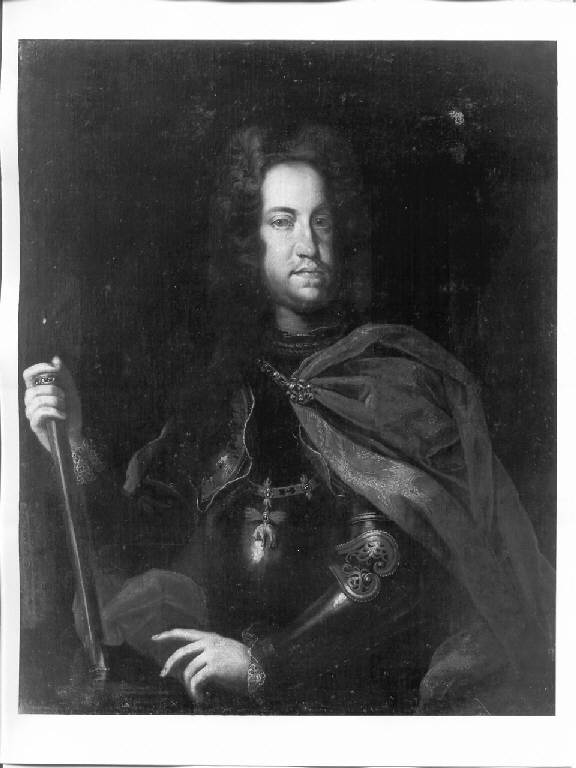 - NOTIZIE STORICO CRITICHE Ercole Teodoro Trivulzio (1620 - 1664) fu principe di Mesocco e del Sacro Romano Impero, Conte di Melzo e Gorgonzola, signore della Valle Mesolcina, di Castelvezio e Codogno, Grande di Spagna, Cavaliere dell'Ordine di Toson d'Oro, Marchese di Maleo, Barone di Retegno. Fu Capitano di Fanteria spagnola, Generale delle Milizie civiche lombarde nel 1646, Ambasciatore spagnolo a Roma nel 1640, Governatore di Lodi nel 1656 e Governatore Generale dello Stato di Milano.\nSposò Orsina Sforza dei Marchesi di Caravaggio, dalla quale ebbe cinque figli: Antonio Maria Teodoro, Caterina, Maria, Giovanna Maria e Dejanira.\nUnico figlio maschio fu Antonio Teodoro, ultimo discendente della casata, che lasciò beni, titolo e nome al cugino Gaetano Gallio.\nErcole Teodoro è raffigurato con i simboli del suo potere: il collare del Toson d'oro e il bastone del comando. \nIl dipinto può essere collocato nell'ambito della pittura lombarda, alla metà del XVII secolo. In particolare l'analisi stilistica del dipinto, il rilievo della struttura corporea, l'impostazione della figura, ferma e dinamica allo stesso tempo, la definizione del volto, espressione di vigore e potenza, risultano vicini ai modi compositivi di Giacinto Santagostino, attivo a Milano fra il 1646 e il 1688.