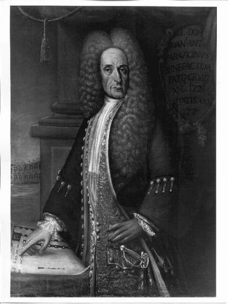 - NOTIZIE STORICO CRITICHE Giovanni Antonio Parravicini, colto collezionista e affermato banchiere con possedimenti estesi in tutta la Lombardia Occidentale, fu benefattore dell'Ospedale Maggiore e del Luogo Pio della Stella, al quale, nel suo testamento del 26 gennaio 1717, lasciò in eredità alcuni beni. \nPiù noto il ritratto dell'Ospedale Maggiore sebbene assai vicino a questo. Qui, a differenza del ritratto della Cà Granda, il personaggio indica con la mano destra una carta che riproduce la piantina dell'erigendo Palazzo delle Stelline, di cui si scorge sul fondo un'ala in costruzione e che è possibile intravedere anche nello sfondo. Sebbene le due tele siano molto simili, iconograficamente è evidente un notevole divario stilistico. L'opera del Pio Albergo Trivulzio risulta più ordinaria e qualitativamente meno elevata rispetto al dipinto della Cà Granda. E' possibile dunque che il dipinto dell'Ospedale Maggiore sia servito come modello. Non ci sono notizie relative all'autore del dipinto.