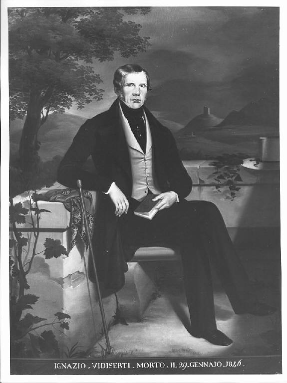 - NOTIZIE STORICO CRITICHE Non si hanno notizie precise relative ad Ignazio Vidiserti; si sa che lasciò un vitalizio annuo al Pio Albergo di lire 100.000. Nel marzo del 1848 l'Ente commissionò il ritratto al pittore Pietro Narducci che lo consegnò ultimato nello stesso anno. A differenza degli altri dipinti eseguiti per l'Ente il Narducci colloca il personaggio in un'ambientazione naturale. L'opera rivela tutte le caratteristiche tipiche della ritrattistica del Narducci oltre ad una maggiore apertura, soprattutto nella soluzione compositiva e luministica, che sembra avvicinarsi maggiormente ad un gusto di tipo romantico.