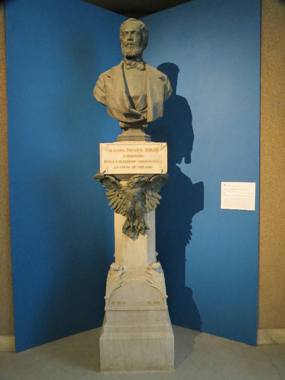- NOTIZIE STORICO CRITICHE Il nome del conte Ercole Turati (Busto Arsizio, 10 luglio 1829 - 1881) è legato al Museo di Storia Naturale dal prezioso lascito della sua raccolta ornitologica, devoluta dagli eredi a questo Istituto a patto che fosse curata, esposta ed ospitata in una sede adeguata (esigenza che stimola la costruzione della nuova sede museale alla fine dell'Ottocento).\nIl busto è voluto dal Museo e finanziato dal Consiglio Comunale di Milano. Secondo i documenti dell'Archivio del Museo, il 12 dicembre 1896 il monumento era già pronto e attendeva di essere trasportato e collocato nel Museo. Il trasporto del busto era reso difficile dal peso rilevante, tanto da richiedere l'intervento dell'Ufficio Tecnico del Comune. Esso viene posto al secondo piano, all'ingresso delle sale che ospitavano la collezione Turati, e rimane coperto da un telo fino al giorno dell'inaugurazione. La cerimonia, a lungo progettata, si tiene domenica 18 aprile 1898, alla presenza del sindaco Giuseppe Vigoni.\nIl monumento, oggi sullo scalone, è opera dello scultore Francesco Confalonieri, autore anche del monumento in bronzo ad Antonio Stoppani (1898) sito nei Giardini Pubblici milanesi, vicino al Museo. \nL'iscrizione sul lato sinistro del busto ricorda invece il nome della fonderia, G. Stradà e C., ditta milanese che esegue anche la fusione della grande statua di Antonio Stoppani sopra ricordata e di quella di Antonio Rosmini, sempre nei Giardini Pubblici di Milano (1896).