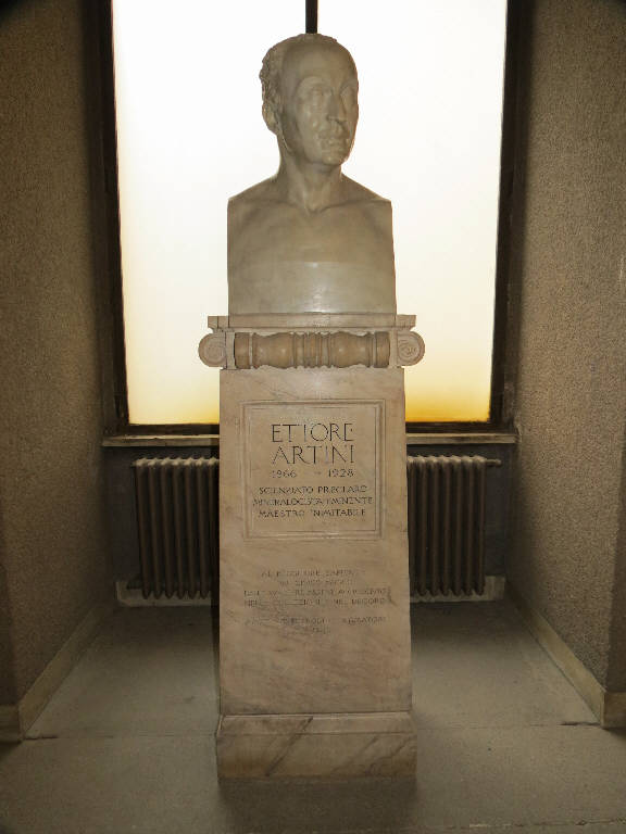 - NOTIZIE STORICO CRITICHE Il busto è voluto dal comitato costituitosi per celebrare le onoranze al professore Ettore Artini (Milano 1866 - 1928), tenutesi il 7 marzo 1929, a un anno dalla scomparsa dello studioso. L'ingegner Codara viene incaricato di presiedere alle celebrazioni. \nL'opera dello scultore Gigi Supino è particolarmente apprezzata perché "ha saputo ritrarre l'Artini vivo e vibrante così come negli istanti nei quali il suo volto s'animava di luce interiore, svolgendo agli allievi qualcuna delle parti più ardue ed insieme attraenti della disciplina prediletta" (Onoranze, 1929, p. 5), vale a dire la mineralogia. Petrografo e mineralogista, nel 1893 viene nominato direttore della sezione di mineralogia del Museo Civico di Storia Naturale di Milano, del quale diventa direttore generale nel 1922. Insegna al Politecnico presso la facoltà di Scienze e scrive manuali scolastici sui minerali e le rocce. \nLa sua formazione e il suo impegno come docente sono ricordati nell'iscrizione sul basamento del busto. In origine, il busto dell'Artini era posto tra quelli di Giorgio Jan e di Giuseppe De Cristoforis.