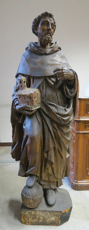 - NOTIZIE STORICO CRITICHE All'interno di un ufficio della Sezione di Botanica al primo piano del Museo, è conservata una scultura in legno raffigurante a grandezza quasi naturale San Domenico di Guzman, fondatore dell'Ordine dei Frati Predicatori, patrono degli astronomi. La statua presenta tutti gli attributi tipici del santo: la stella in fronte; il libro nella mano destra; il giglio, oggi assente, ma che doveva essere posto nella mano sinistra atteggiata a sorreggerne il gambo; il globo sotto il piede. E' da notare che sopra il libro è stato attaccato il modellino di una chiesa, probabilmente aggiunta successivamente e forse di legno diverso. Non si conosce la provenienza originale della statua, anche se si può ipotizzare che sia stata realizzata per un contesto religioso domenicano (chiesa, convento, oratorio). \nLa scultura, in legno di noce, è cava. L'incavo è stato praticato sul lato posteriore, forse per alleggerirne il peso. La tavola di chiusura è ora staccata e posizionata a fianco della statua.\nL'opera viene donata nel 1940 alla Civica Siloteca Cormio (dal 1973 accorpata al Museo di Storia Naturale) dal fotografo milanese Italo Pacchioni (Mirandola di Modena, 29 marzo 1872 - Milano, 11 luglio 1940). L'importanza da subito attribuita all'opera è dimostrata dal fatto che nell'inventario degli esemplari acquisiti dalla Siloteca le viene attribuito appositamente il numero 5000: il Cormio indica come data di arrivo il 7 maggio 1940 e riporta che la registrazione era "avvenuta spostata perché desideravo che questo campione portasse il n° 5000". In merito alla donazione, interessanti documenti sono conservati nell'archivio della Siloteca. In una lettera del 14 maggio 1940, Pacchioni scrive al direttore della Siloteca Raffaele Cormio per comunicargli la sua decisione di offrire all'istituto questa scultura, che da molti anni faceva parte della sua raccolta privata e che il Cormio aveva visto ed apprezzato. Il proprietario ammette di essere intervenuto personalmente per rimuovere le "vandaliche incrostazioni subite attraverso i secoli", possibile allusione a quelle che sembrano tracce di pittura soprattutto sul lato posteriore. Nel post scriptum alla stessa lettera, il Pacchioni si raccomanda invece di non rimuovere la chiesetta tenuta in mano dal santo, dato che essa "forma un tono interessantissimo e documento di autenticità". Purtroppo la conformazione dell'edificio non sembra poter essere indizio sufficiente per identificare la provenienza della statua. Il San Domenico sarebbe stato accolto nella Siloteca "a testimonianza del genio artistico dimostrato anche in questa nobilissima tecnica [l'intaglio del legno] dagli artisti italiani". Questa finalità era già stata evidenziata in alcune pubblicazioni del Cormio, in cui compare la fotografia dell'opera (ancora di proprietà Pacchioni) come esempio della tecnica della scultura in legno a tutto tondo e della durevolezza dei manufatti lignei, come dimostrato dal fatto che "molte statue di santi, pur vecchie di molti secoli, che popolano le chiese, sono fatte di legno" (Cormio, 1936 e 1939). La statua viene pubblicata insieme ad un'altra opera della raccolta Pacchioni, un altorilievo in legno di bosso raffigurante "Sul Golgota, adorazione di Cristo fra i ladroni", eseguito dal Fantoni di Bergamo nel 1700. La fotografia dell'opera, di cui non si conosce l'attuale collocazione, è conservata nell'archivio del Museo. Il Pacchioni, oggi noto come pioniere del cinema, doveva essere dunque anche collezionista di opere d'arte, come dimostra la documentazione riguardante la donazione della statua (16 maggio 1940), in cui il Pacchioni è definito "noto collezionista di quadri e di oggetti d'arte". Purtroppo non sono state finora rintracciate ulteriori testimonianze attestanti il collezionismo del fotografo. \nSecondo i documenti conservati nella Siloteca Cormio, la datazione della statua risale al XVI secolo. Tale cronologia, pur non suffragata da documentazione, appare pienamente condivisibile, mentre i caratteri stilistici fanno propendere per un'attribuzione a maestro lombardo o veneto. La statua è stata recentissimamente inserita nella pubblicazione sulla flora dipinta nelle opere di Bernardino Luini (2014), nella parte introduttiva curata da Giovanni Agosti e Jacopo Stoppa, per i quali si tratta di una "scultura lignea lombarda del pieno Cinquecento all'uscita della parabola dei Del Maino". L'inquadramento in uno specifico ambito necessita di ulteriori approfondimenti e forse è da spostare verso la produzione dei Da Corbetta.