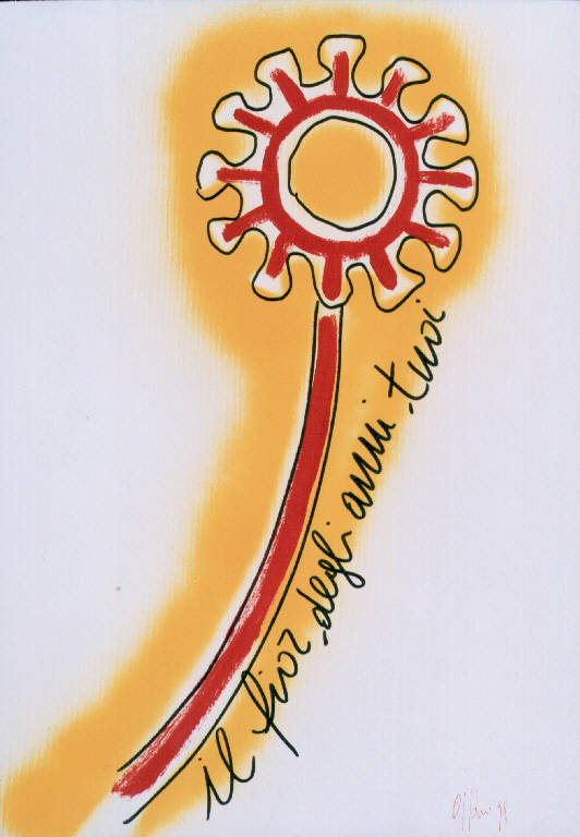 Opera pittorica che rappresenta un fiore stilizzato. I colori sono caldi: rosso e giallo. Seguendo l'andamento del gambo c'è scritto: il fior degli anni tuoi.