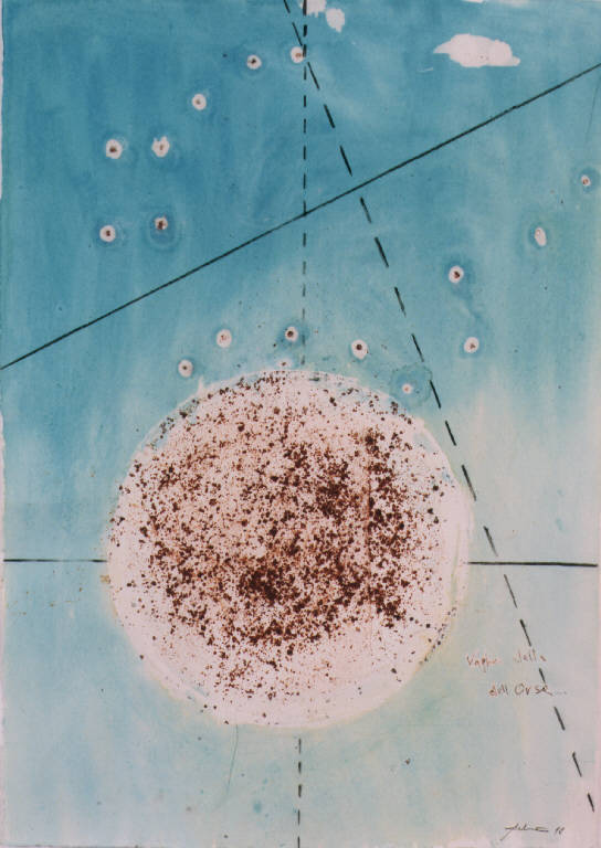 Opera pittorica che rappresenta al centro la luna e attorno le stelle. Per il cielo azzurro passano direttrici a linea continua o tratteggiata. La supreficie della luna è resa con la sabbia.