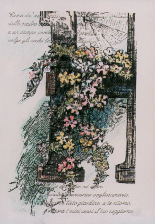 Opera pittorica che rappresenta dei fiori su una finestra. In alto e n basso sono riportati versi di G. Leopardi.
