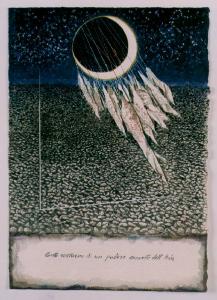 Opera in carta che rappresenta uno spicchio di luna a rilievo. Lungo il bordo in basso vi sono simboli eseguiti a impressione.