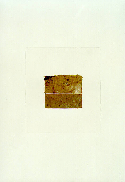 Opera caratterizzata da due rettangoli di carta marrone dai contorrni irregolari, incollati al centro di un cartoncino biano quadrato, incollato su un cartoncino bianco rettangolare.
