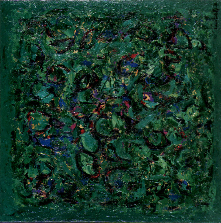 Opera caratterizzata da una materia pittorica grumosa e spessa che rappresenta fiori e piante.