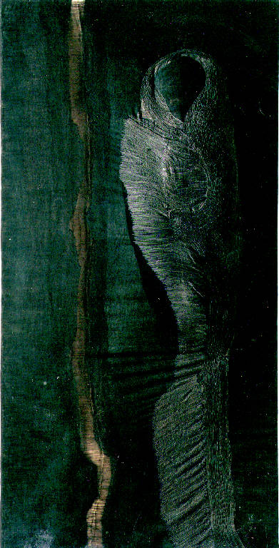 Opera in tessuto con una parte rigonfiata sporgente a forma di figura stilizzata. A retro, sulla tela si vedono le cuciture.
