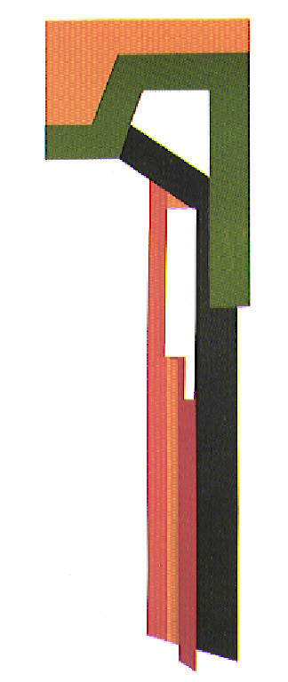 Opera polimaterica di forma sagomata di colore nero. La costruzione composita e dinamica rappresenta una forma triangolare.