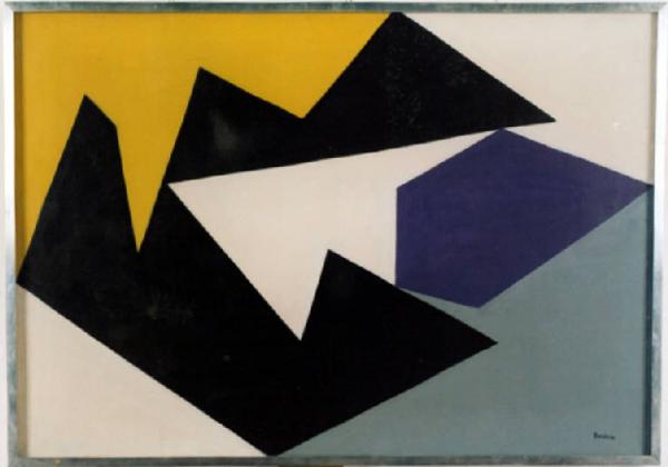 Opera pittorica caratterizzata da una forma poligonale irregolare che si svolge in uno spazio piatto. Colore: giallo, nero, bianco, viola, grigio\nStesura: uniforme e compatta. Struttura: dinamica.