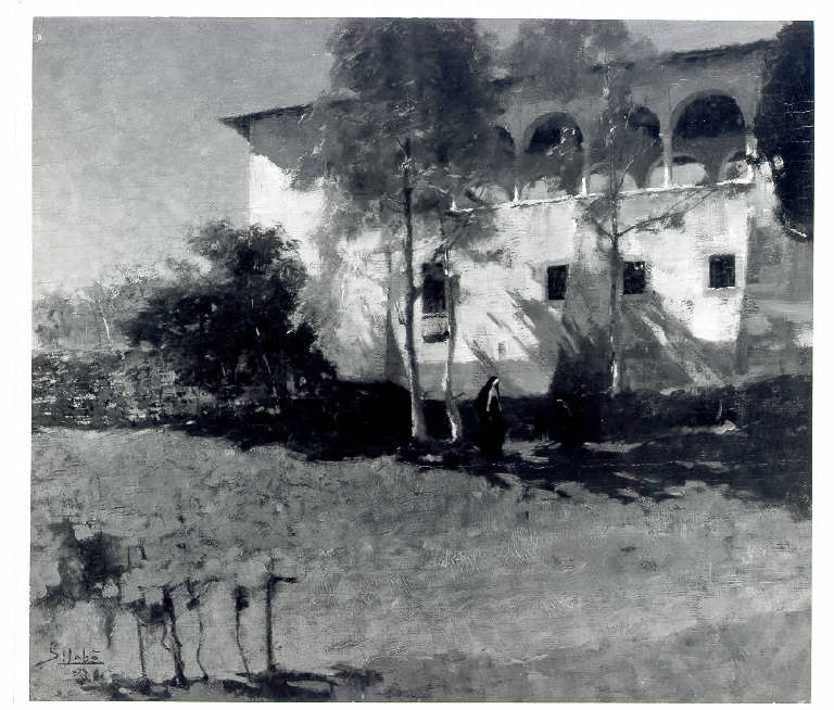Opera pittorica che rappresenta un convento inserito in un paesaggio verdeggiante. La stesura è veloce e franta. La luce laterale illumina il convento e proietta le ombre degli alberi.