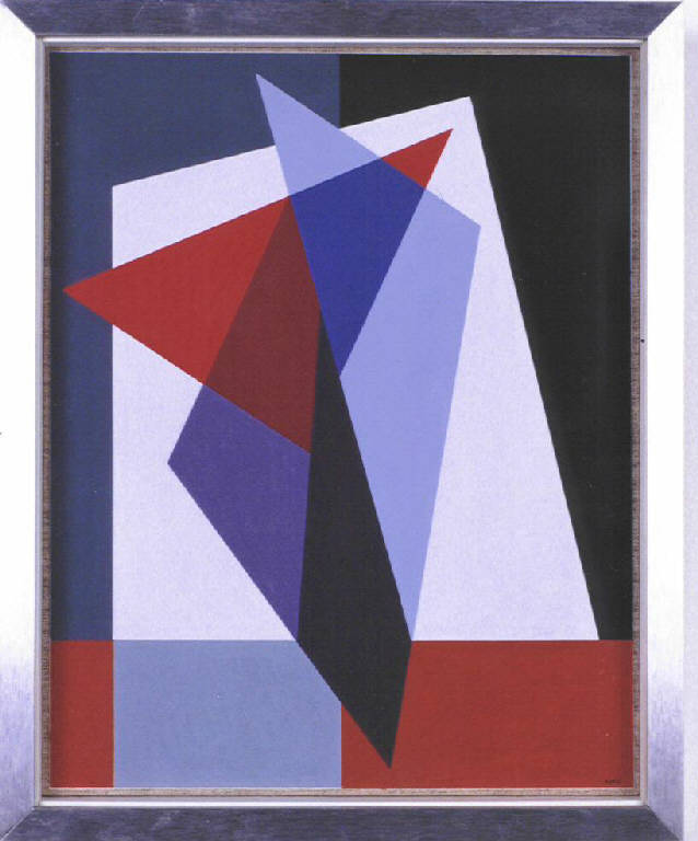 Opera pittorica costituita da una composizione di figure geometriche regolari e irregolari sovrapposte le une sulle altre secondo una disposizione verticale. Il colore è grigio, rosso, bianco, blu. La stesura è sottile; uniforme; piatta. La luce è contrastata.