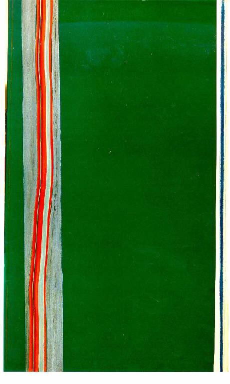 Opera pittorica caratterizzata da una composizione di linee verticali continue ma irregolari collocate lungo il margine sinistro e destro dello spazio compositivo per il resto uniforme e piatto. Il colore è caldo (rosso, verde); piatto. La stesura è uniforme; piatta. La struttura è statica.
