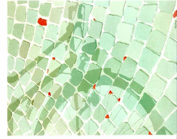 Opera pittorica che rappresenta l'obra di una biciletta è riflessa su una pavimetazione a pavè. Il colore è tonale; freddo (grigio); sfumato.\nLa stesura è sottile; uniforme. La luce viene dall'alto ed è contrastata.