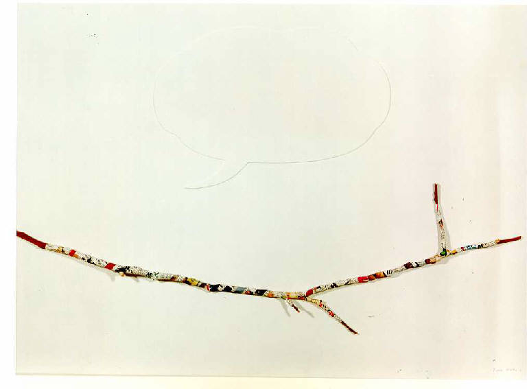 Un bastoncino di legno secco e ricoperto di carta di giornali è collocato nella metà inferiore del campo compositivo bianco. Nella metà superiore esce una nuvoletta fumettistica del pensiero bianca e vuota.