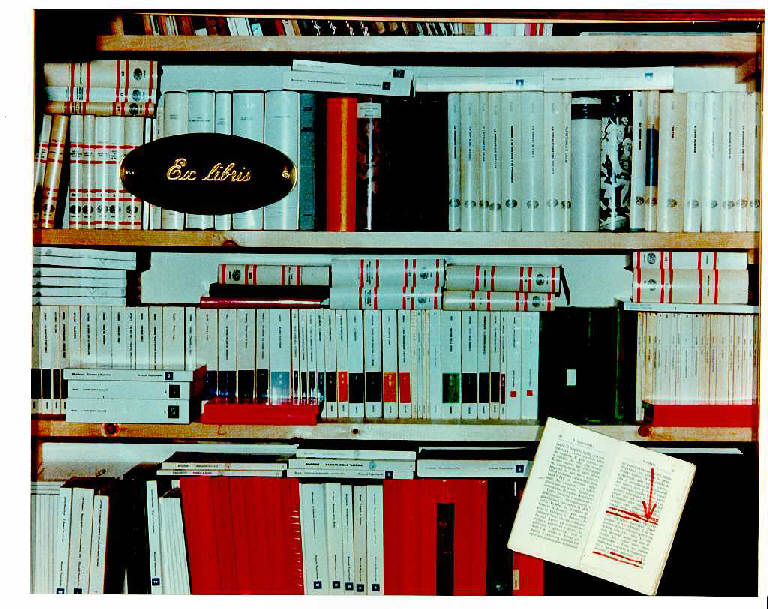Una targa di ottone ovale con l'incisione "Ex lbris" e un libro aperto di Dostoewsky, sono incollati sulla riproduzione fotografica di tre scaffali di una libreria, rispettivamente in alto a sinistra la targa e in basso a destra il libro.\nSegno: scrittura (orizzontale, corsivo, a stampa, periodo).