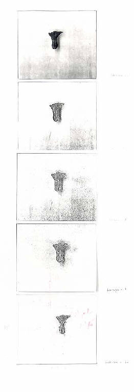 Cinque fotocopie sono incollate una sopra all'altra secondo una struttura verticale. All'interno di ciascuna fotocopia è riprodotta la medesima forma libera e indistinta, che risulta sempre più chiara e alla fine quasi illeggibile.