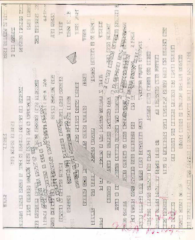 Opera pittorica in cui lo spazio compositivo è occupato da piccoli segni disposti in caselle quadrate accostate secondo un andamento prevalentemente orizzontale. Linea sottile, spezzata, ondulata.
