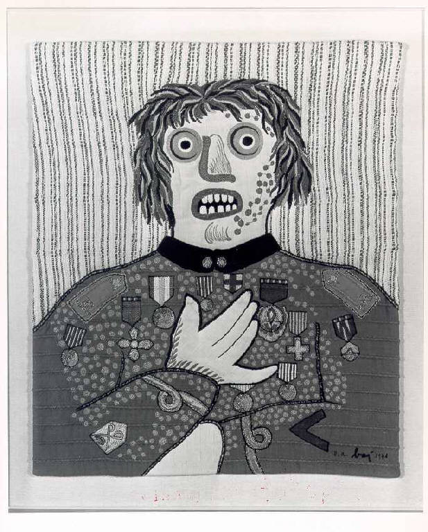 Ritatto d'uomo a mezzo busto e frontale realizzato con stoffe e ricami, deformato nel volto e nelle parti anatomiche. Il piano di fondo è a righe verticali. Colore: cromatico; caldo; piatto. Struttura: statica.
