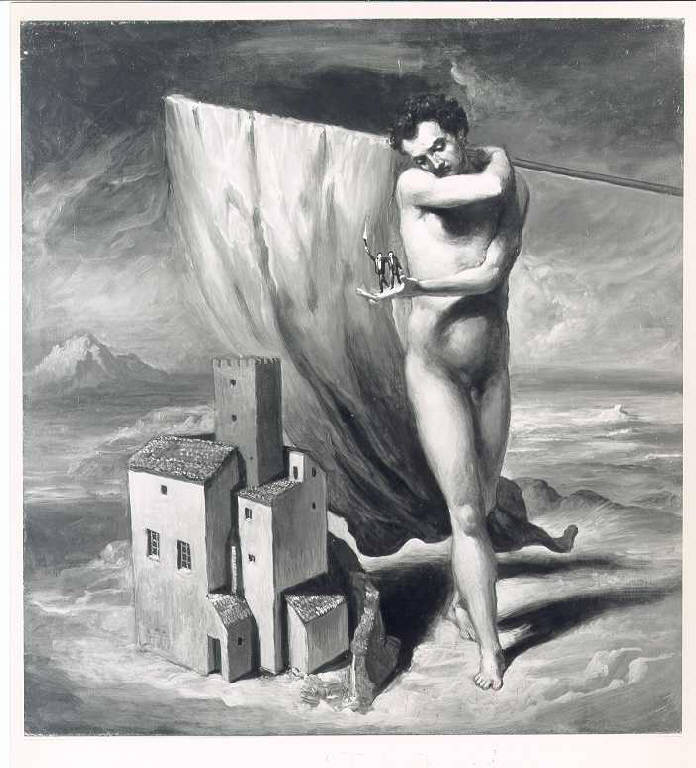 Opera che rappresenta in primo piano a destra un gigante che regge con la mano destra una bandiera appoggiata alla spalla e con la mano sinistra due piccoli uomini in giacca e cravatta. A fianco del gigante un caseggiato con torre e muro di cinta; intorno si apre un ampio paesaggio di pianura e montagna. Il colore è tonale; caldo; sfumato. La stesura è uniforme; sottile. La luce è contrastata; laterale.