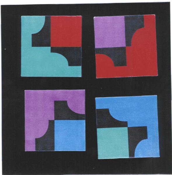 Opera pittorica costituita da una composizione di forme geometriche regolari su quattro tele quadrate appoggiate ad un supporto metallico nero quadrato e spostabili dallo spettatore in infinnite variazioni.\nIl colore è caldo (rosso); freddo (viola, azzurro, verde); acromatico (nero); piatto. La stesura è uniforme; piatta.