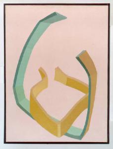 Opera pittorica in cui all'interno dello spazio compositivo si dispongono due fasce intersecate a effetto tridimensionale che segnano la profondità e l'altezza. Il colore è tonale; caldo (giallo, rosa); freddo (azzurro, verde); piatto. La stesura è sottile; uniforme; piatta. La luce è diffusa.