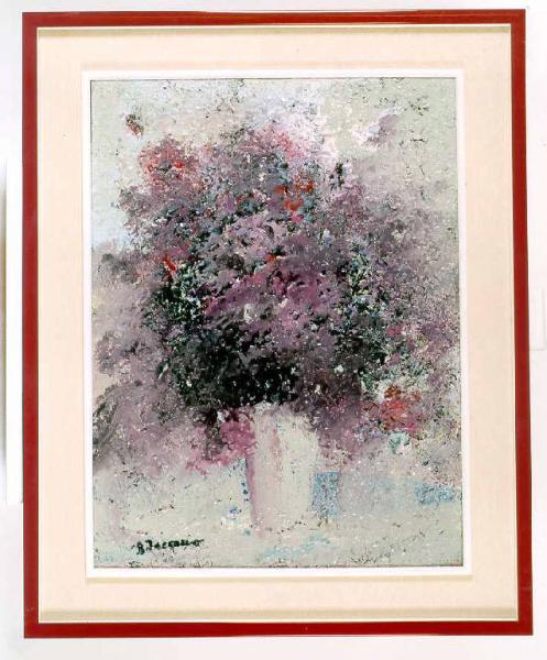 Opera pittorica che rappresenta un vaso di fiori descritto in modo informale con una materia veloce e stratificata dalle sfumature viola. Il colore è tonale; freddo (viola, azzurro). La stesura è stratificata; grumosa; granulosa. Luce: dal basso.