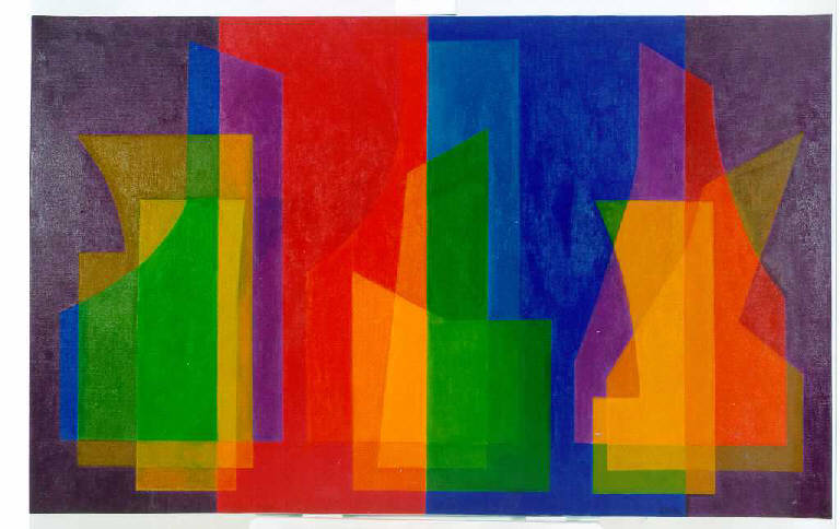 Composizione di forme geometriche regolari e irregolari sovrapposte secondo un andamento orizzontale per creare effetti di trasparenza cromatica. Colore: cromatico; caldo (giallo, arancio); freddo (azzurro, verde); piatto; velato. Stesura: tesa; uniforme; velata. Struttura: ritmica.\nLuce: uniforme.