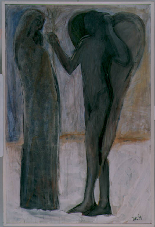 In primo piano l'annunciazione con la Vergine a sinistra e l'amgelo annunciante a destra. Lo sfondo è libero e informale.\nColore: tonale, freddo (grigi). Stesura: veloce.