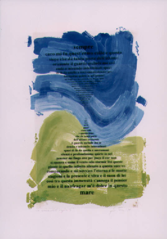 La poesia di Leopardi diventa graficamente un'onda in andata e ritorno.\nIl colere è freddo (verde, azzurro). La stesura è stratificata.