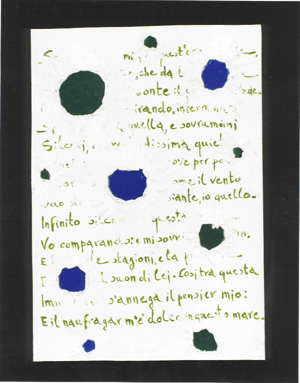 All'interno di un fondo bianco materico si aprono dei buchi verdi e azzurri, come crateri. Riempiono lo spazio bianco parole in corsivo.\nIl colore è cromatico, freddo (verde, azzurro).