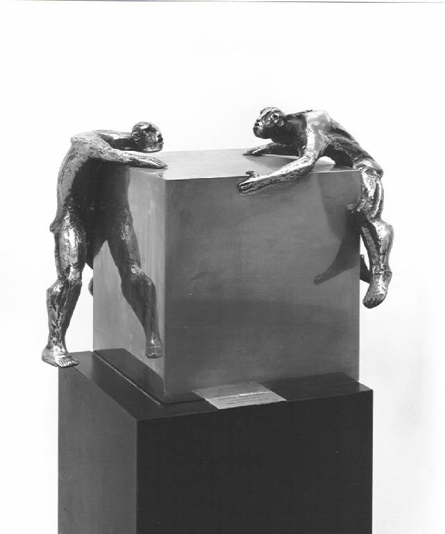Opera polimaterica scolpita a tutto tondo costituita da un cubo in ottone cromato e da due figure umane in argentone che si arrampicano su di esso.