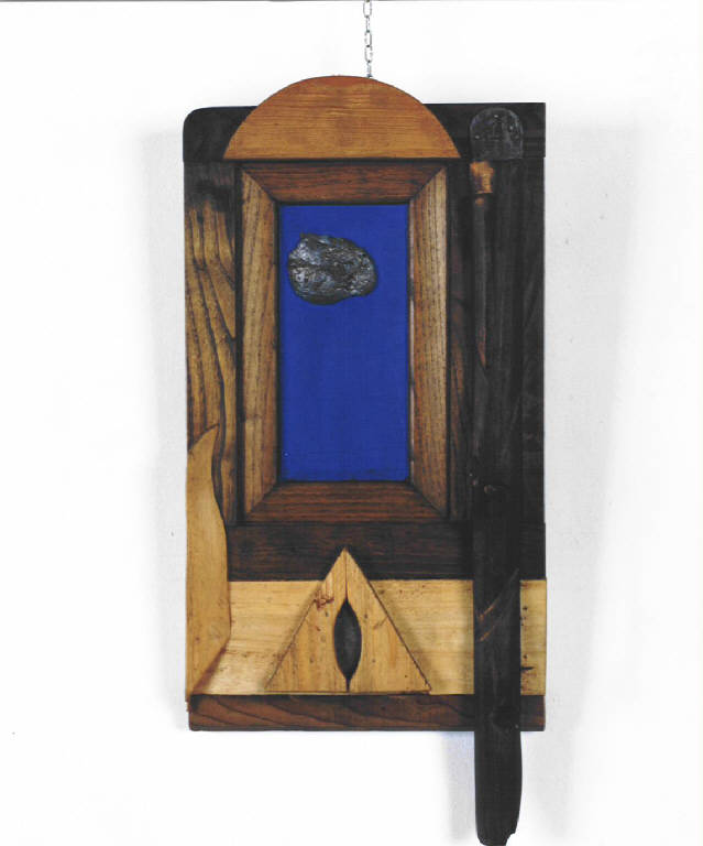 - NOTIZIE STORICO CRITICHE Opera costituita da diversi tipi di legno di colore e di forme diverse, assemblati anche uno sopra l'altro. il riquadro al centro rappresenta una finestra dipinta in azzurro e al centro del piombo. L'opera è da appendere.