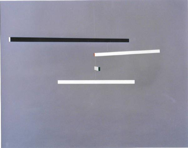 Opera costituita da 4 aste di legno dipinto collegate da un filo di nylon. La prima asta è nera e bianca ai lati, la seconda è binca e arancio e viola ai lati, la terza è bianca e rossa e verde ai lati, la quarta è bianca e gialla e blu ai lati. L'opera si muove nello spazio con leggeri spostamenti d'aria.