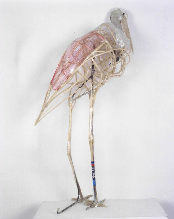 L'opera è costituita da uno scheletro di asticciole di legno prese dalle cassette della frutta e da un rivestimento in plastica e da altri materiali di scarto.