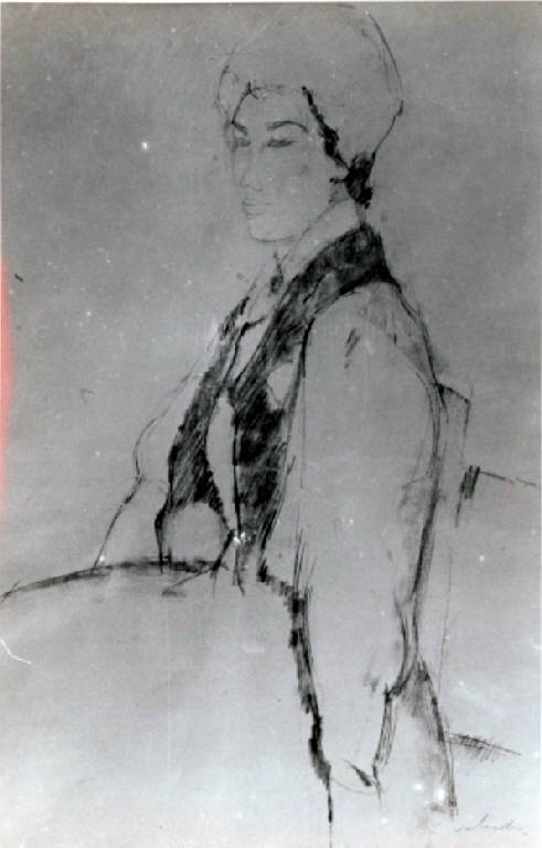 Opera a tecnica mista su carta che rappresena una donna seduta; il viso è reso con un tratto leggero, il capo è appena accennato.