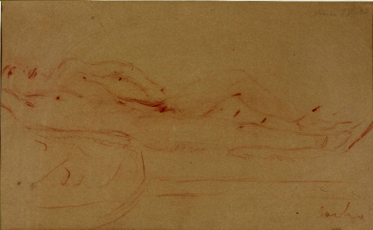 Opera a sanguigna che rappresenta una donna nuda sdraiata su un letto; indossa solo delle scapette per la danza, il braccio destro è piegato e sembra sorreggere la nuca, il viso sorridente della donna è appena accennato ed è rivolto allo spettatore.